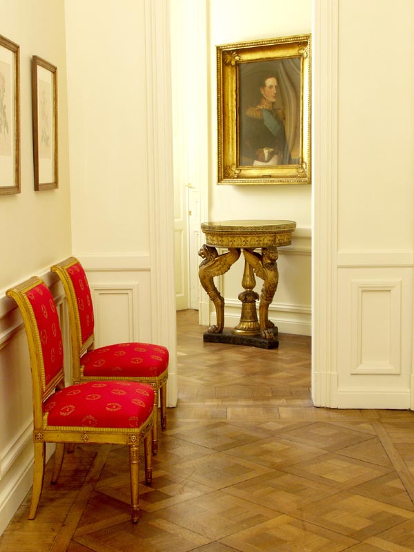 La cama, el secretaire y la cómoda son las piezas principales del mobiliario de dormitorio de época napoleónica. Están realizados en arce con aplicación de magníficos bronces cincelados. La cama es en forma de g{ondola, con dosel de seda. Una magnífica mesa tocador y escritorio del ebanista David Roentgen de época Luis XVI en madera de caoba completa el conjunto. La sala se ilumina con una gran araña de cristal con figuras de bronce que representan el Carro de Apolo.
